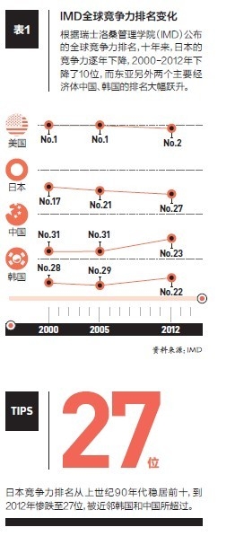 伴之而來的是日本國(guó)家競(jìng)爭(zhēng)力的下降。當(dāng)上世紀(jì)90年代早期,瑞士洛桑國(guó)際管理學(xué)院將日本首次列入其全球競(jìng)爭(zhēng)力排名中后,在接下來的十年時(shí)間里,日本的競(jìng)爭(zhēng)力排名穩(wěn)居前10名,但是到2012年,排名卻慘跌到了27位,為近鄰韓國(guó)和中國(guó)所超越。