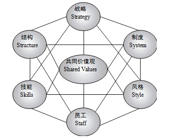 這就是著名的7S模型。從中可以看到,共同的價值觀(Shared Values)處于核心的位置,也就是說,它是一個公司成功的核心。