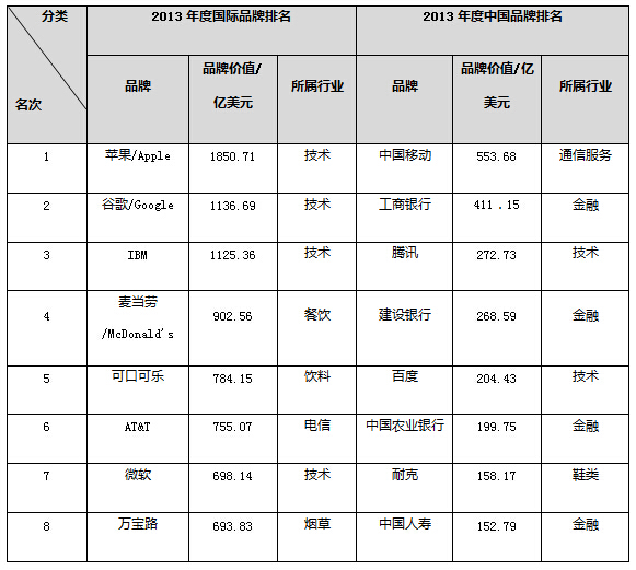 在2013年BRANDZ全球最具價值品牌百強(qiáng)排行榜中,蘋果以1850億美元的品牌價值蟬聯(lián)2013年“BrandZTM全球最具價值品牌100強(qiáng)”榜首,而前九為都為美國企業(yè),中國移動作為中國最高價值的品牌排在第十位,中國品牌需要在創(chuàng)新及國際化方面有更多進(jìn)步:共有12家中國公司登上了百強(qiáng)榜單,品牌總價值達(dá)到2.7千億美元。在亞洲10大品牌中,中國品牌占據(jù)6位,數(shù)量超過日本和韓國。