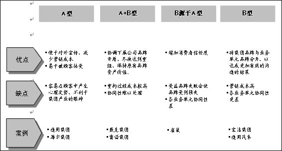 集團(tuán)品牌是業(yè)務(wù)單元品牌的組合體,業(yè)務(wù)單元共同分擔(dān)了集團(tuán)品牌營銷的責(zé)任,以前的梅賽德斯-奔馳,現(xiàn)在的戴克集團(tuán),雷諾日產(chǎn)集團(tuán),他們都是采用聯(lián)合品牌模式,這些集團(tuán)都是屬于強(qiáng)強(qiáng)聯(lián)合的結(jié)果。