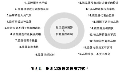 德拉貝克和佩里發(fā)現(xiàn),一個突如其來的、始料不及的信號尤其是表示人和物將要受到威脅的信號容易被人忽視。因此,品牌危機管理者常常面對預(yù)警信號反應(yīng)遲鈍,有時看到了預(yù)警信號卻采取觀望態(tài)度。這種反應(yīng)的根源有以下幾種:品牌規(guī)模過大,信息傳輸不暢;品牌文化,對嚴格的正式的規(guī)章制度不重視;品牌內(nèi)部溝通不充分,缺少溝通人員;缺乏統(tǒng)一管理的負責人。要發(fā)現(xiàn)這些預(yù)警信息必須建立信息監(jiān)控機制,我們通過總結(jié)集團品牌預(yù)警可以采取以下預(yù)測方式,如圖5-14 所示。