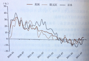 以實(shí)際GDP同比增長率(經(jīng)季節(jié)調(diào)整)計(jì)算,歐盟(27國)經(jīng)濟(jì)在經(jīng)歷連續(xù)五個(gè)季度的收縮后,于2013年三季度再度實(shí)現(xiàn)正增長。德國總理默克爾成功連任,意味著歐洲推進(jìn)財(cái)政整頓和結(jié)構(gòu)改革的政策將保持穩(wěn)定。因此,2014年歐洲經(jīng)濟(jì)的復(fù)蘇很可能成為拉動(dòng)全球經(jīng)濟(jì)增長的主要力量。
