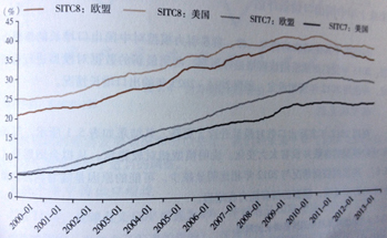 進(jìn)入新世紀(jì)以來,我國工業(yè)制成品在歐盟和美國進(jìn)口中的比重一直快速提高,但從2011年以來,在美國的份額增長已陷入停滯,早歐盟的份額則緩慢下滑。分產(chǎn)品看,傳統(tǒng)勞動(dòng)密集型產(chǎn)品在歐美的份額均已連續(xù)第三年下滑,以加工組裝為主的機(jī)械和電子產(chǎn)品在歐盟的份額連續(xù)第三年停滯,在美國連續(xù)第四年停滯。