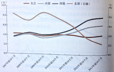 2013年前10個(gè)月,東部占我國出口的比重為82%,比2009年同期回落6個(gè)百分點(diǎn),已是連續(xù)第四年下降,西部和中部的比重則是連續(xù)第四年上升,分別達(dá)到8%和6%,顯示出國內(nèi)由東南沿海向內(nèi)陸省份的產(chǎn)業(yè)轉(zhuǎn)移不斷推進(jìn)。