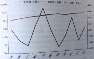 利用2012年實(shí)際出口數(shù)對模型進(jìn)行了更新,其結(jié)果如表5.1所示。與2012年比較模型的參數(shù)并沒有太大變化。說明模型相對較穩(wěn)定。從擬合圖形看(圖5.6),殘差的波動(dòng)情況與2012年相比明顯減少??赡艿脑蚴请S著國際金融危機(jī)影響逐步減弱,模型的解釋能力在增強(qiáng)。
