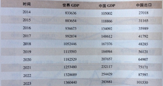 過去11年,全國名義GDP增速為8%,中國名義GDP增速為19%(其中包含了價(jià)格的影響,也包含了匯率的影響)。按照其他章節(jié)對未來十年GDP實(shí)際增長速度和中國匯率升值的預(yù)測,并假定GDP平減指數(shù)年平均為3%;全球經(jīng)濟(jì)平均名義增速也從8%下降為6%,則未來十年中國出口名義增速可以達(dá)到平均16%,到2023年出口名義值大約是當(dāng)前的5倍(參見表5.2)。