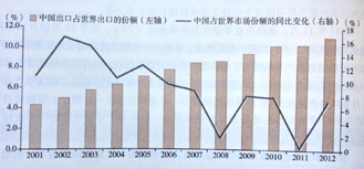 圖5.7 中國在世界市場份額的變化情況(2000~2012年)