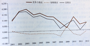 本文利用恒定貿(mào)易份額分析法和顯性貿(mào)易優(yōu)勢指數(shù)分析法分析了中國出口競爭力過去十年的變化,得出的主要結(jié)論包括:2012年中國在世界市場份額的陡升主要源于結(jié)構(gòu)效應(yīng),而非競爭力效應(yīng);以紡織、服裝、鞋類為代表的傳統(tǒng)勞動(dòng)密集型產(chǎn)品、以加工組裝為主的辦公機(jī)械和通訊設(shè)備等拉動(dòng)中國出口增長的兩大類主要產(chǎn)品的國際競爭力都正在減弱。