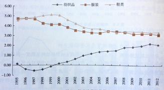 圖5.9中國紡織品、服裝、鞋類的顯性貿(mào)易優(yōu)勢指數(shù)(RTA)