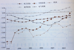 圖5.12 中國通用設(shè)備、專用設(shè)備、電力設(shè)備、機(jī)床和電氣機(jī)械的顯性貿(mào)易優(yōu)勢指數(shù)(RTA)