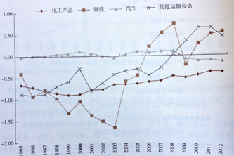 圖5.13 中國化工、鋼鐵和運(yùn)輸設(shè)備的顯性貿(mào)易優(yōu)勢指數(shù)(RTA)
