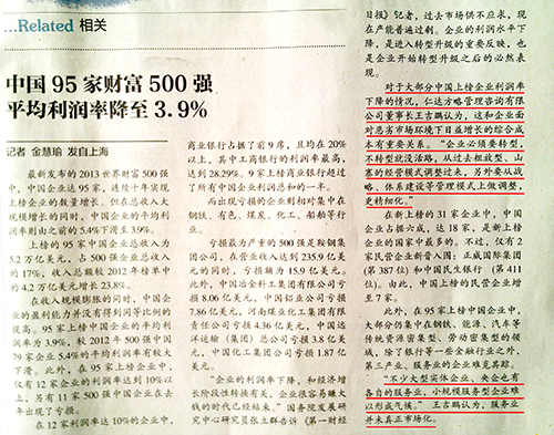 世界財(cái)富500強(qiáng)中,中國企業(yè)達(dá)95家,連續(xù)十年實(shí)現(xiàn)上榜企業(yè)的數(shù)量增長。但在總收入大規(guī)模增長的同時,中國企業(yè)的平均利潤率則由之前 的5.4%下滑至3.9%。