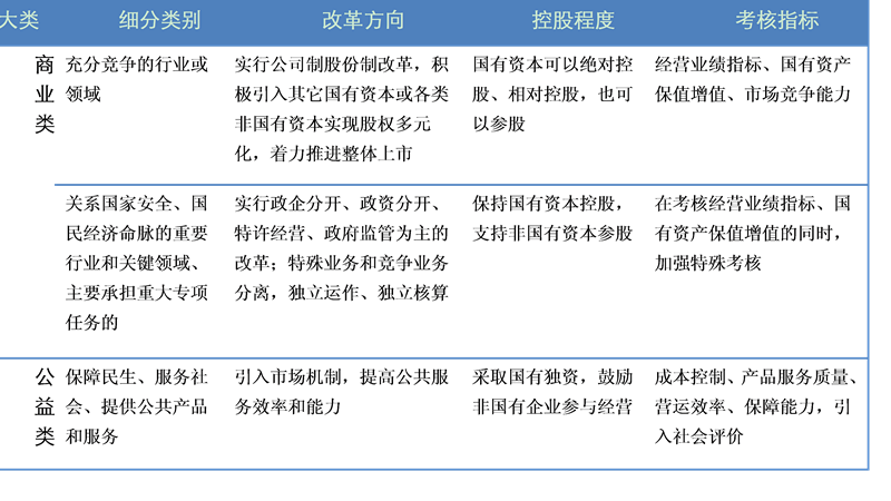 分類推進國有企業(yè)改革。根據國有資本的戰(zhàn)略定位和發(fā)展目標,結合不同國有企業(yè)在經濟社會發(fā)展中的作用、現狀和發(fā)展需要,將國有企業(yè)分為商業(yè)類和公益類。