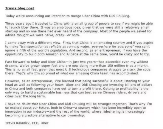 “在中國(guó)城市提供可持續(xù)服務(wù),以及這個(gè)服務(wù)賴(lài)以生存的乘客和司機(jī),是我們實(shí)現(xiàn)盈利的唯一可能?!?/span>其實(shí)就在當(dāng)天上午,一篇署名為特拉維斯·卡蘭尼克(Travis Kalanick)的博文里稱(chēng),優(yōu)步中國(guó)與滴滴正有意合并: