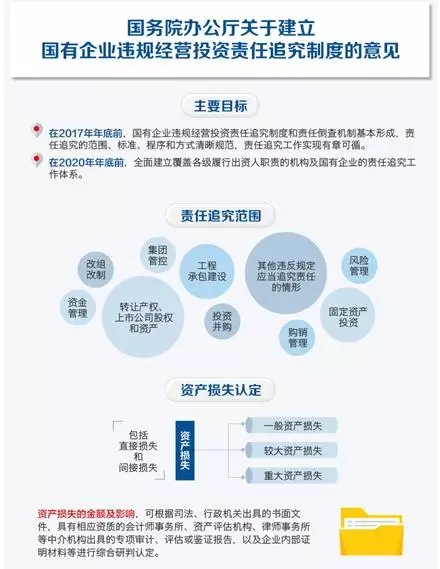 2016年8月23日,國務(wù)院辦公廳印發(fā)《關(guān)于建立國有企業(yè)違規(guī)經(jīng)營投資責(zé)任追究制度的意見》(以下簡稱《意見》),《意見》旨在通過制度安排完善國有資產(chǎn)監(jiān)管、落實國有資本保值增值責(zé)任、防止國有資產(chǎn)流失。