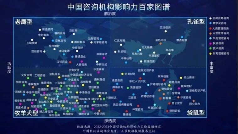 從前沿度、滲透度、豐富度和活躍度來看,百家矩陣的咨詢機構(gòu)分為孔雀型、老鷹型、袋鼠型和牧羊犬型??兹感妥稍儥C構(gòu)表現(xiàn)力強,關(guān)注行業(yè)熱點,積極以報道、活動、課程等多種形式傳播品牌;老鷹型咨詢機構(gòu)密切關(guān)注政策趨勢并提供決策支持,戰(zhàn)略性和專業(yè)性強;袋鼠型咨詢機構(gòu)聚焦垂直細分領(lǐng)域的賦能管理,輔助落地執(zhí)行;牧羊犬型咨詢機構(gòu)深耕專業(yè)領(lǐng)域,以業(yè)務(wù)技術(shù)的專業(yè)實力和資質(zhì)水平作為傳播亮點。