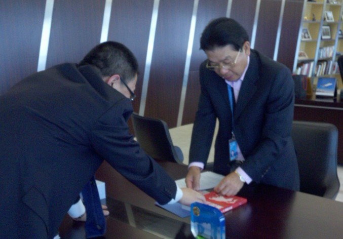 會談期間,王吉鵬董事長向何享健先生贈書(《如何掌控集團企業(yè)》)