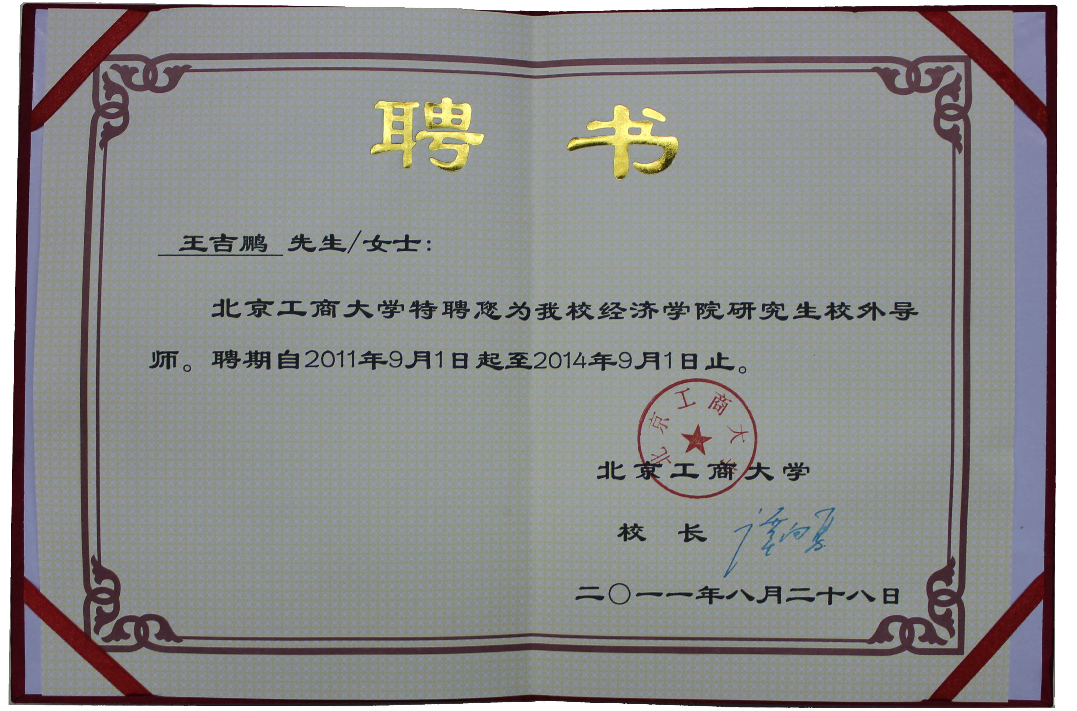 王吉鵬董事長受聘為北京工商大學(xué)經(jīng)濟(jì)學(xué)院研究生校外導(dǎo)師