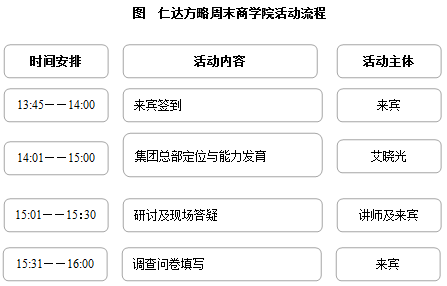 仁達(dá)方略周末商學(xué)院的活動(dòng)流程如下圖所示。
