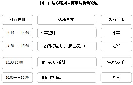 【本文導讀】一、仁達方略周末商學院活動基本信息 課程名稱:《如何打造成功的商業(yè)模式》 時間安排:2013年7月26日(星期五)14:30-16:30 報名條件:企業(yè)家、中高層管理者、在讀MBA、EMBA人員 報名人數:30人 課程費用:免費