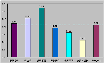 通過對企業(yè)文化問卷的統(tǒng)計分析,用專業(yè)的統(tǒng)計方法對所得數(shù)據(jù)進(jìn)行聚類分析和因子分析。我們計算出我國石油行業(yè)的企業(yè)文化的總體得分為3.62分(5分制量表,最高分為5分,最低分為1分,3分表示中間態(tài)度)。高于我們近期所做的電力行業(yè)與房地產(chǎn)行業(yè)企業(yè)文化的總體得分。問卷中涉及到的六個方面,愿景目標(biāo)、價值觀和組織氛圍得分都高于石油企業(yè)文化的總體得分,而團(tuán)隊協(xié)作、組織學(xué)習(xí)、決策與授權(quán)得分低于企業(yè)文化總體得分。其中組織氛圍得分最高,決策與授權(quán)得分最低。這樣的得分基本上反映了我國石油行業(yè)企業(yè)文化建設(shè)與管理的現(xiàn)狀,既有幾十年石油文化的優(yōu)良傳統(tǒng),又需要在加入WTO后的新經(jīng)濟(jì)條件下不斷創(chuàng)新與變革。