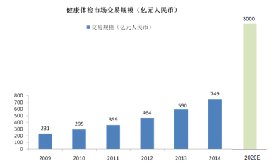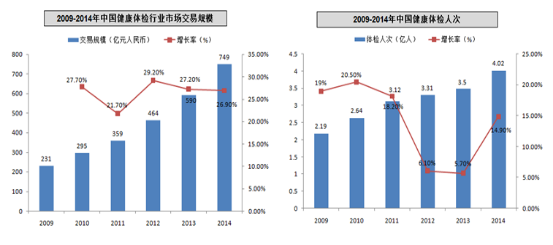 據(jù)統(tǒng)計(jì),目前我國(guó)基本符合健康定義的健康人只占全國(guó)總?cè)丝跀?shù)的5%,其余的有20%處于疾病狀態(tài),剩余的75%屬于亞健康狀態(tài)。定期進(jìn)行健康體檢,提早發(fā)現(xiàn)隱患正成為人們一種新的消費(fèi)需求。2014年,我國(guó)健康體檢行業(yè)市場(chǎng)交易規(guī)模達(dá)到749億元,健康體檢人次達(dá)4.02億人。從20092014年,市場(chǎng)交易規(guī)模年復(fù)合增長(zhǎng)率超過20%(如下圖所示)。