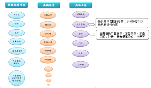 從提供的服務(wù)內(nèi)容來看,專業(yè)體檢機(jī)構(gòu)主要以常規(guī)體檢為主(占業(yè)務(wù)收入85%),輔之以疾病篩查服務(wù)(占業(yè)務(wù)收入8%)和其他增值服務(wù)(7%)(如下圖所示)。